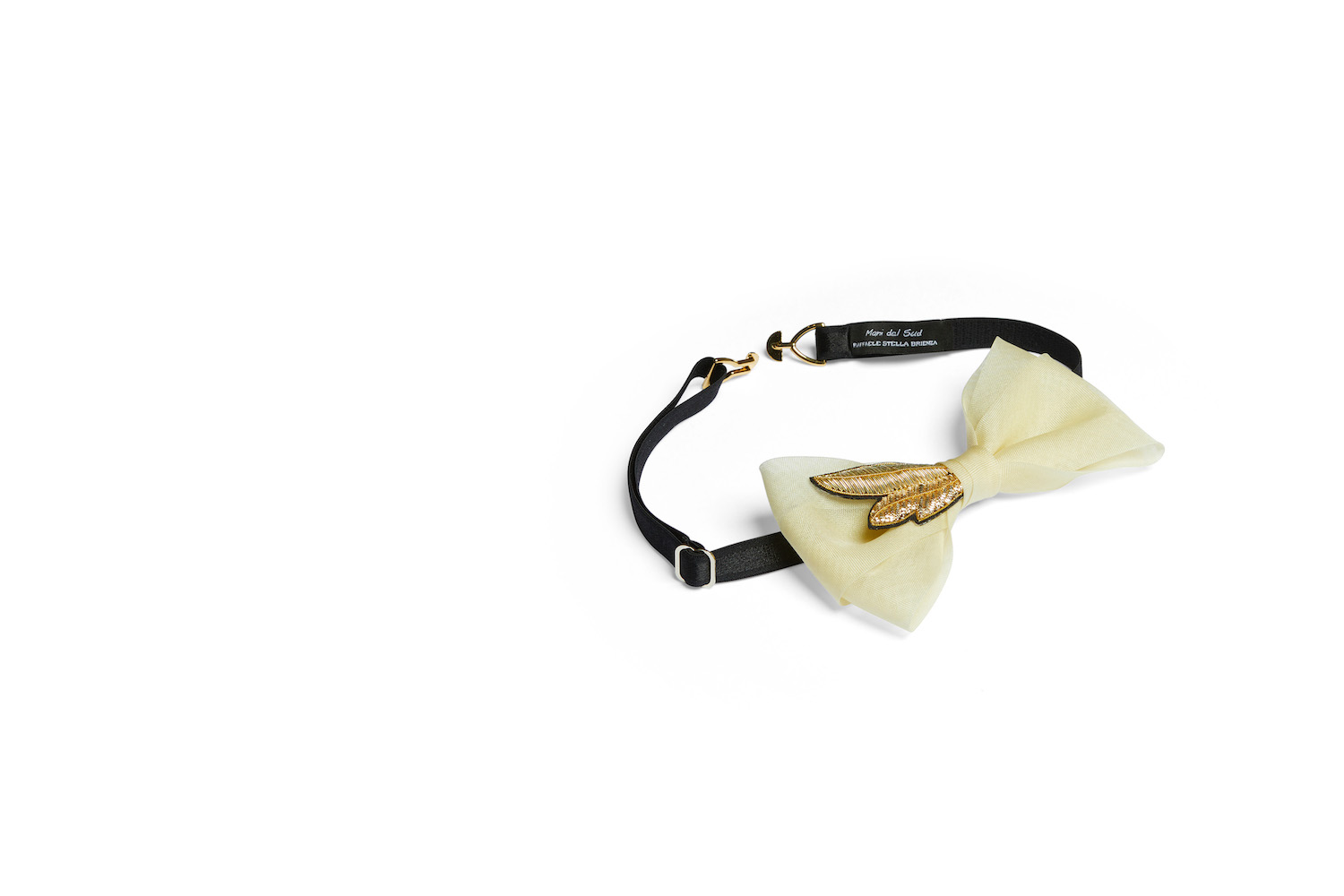 Our bow ties are made in Italy products and every single one of them is manufactured by the same hands. The galvanisation of the metal latches guarantees a fine and long-lasting colouring; this is achieved in a manual (not industrial) process by submerging each piece individually in a bath of molten metal. The adjustable elastic strap is practical and comfortable to use.